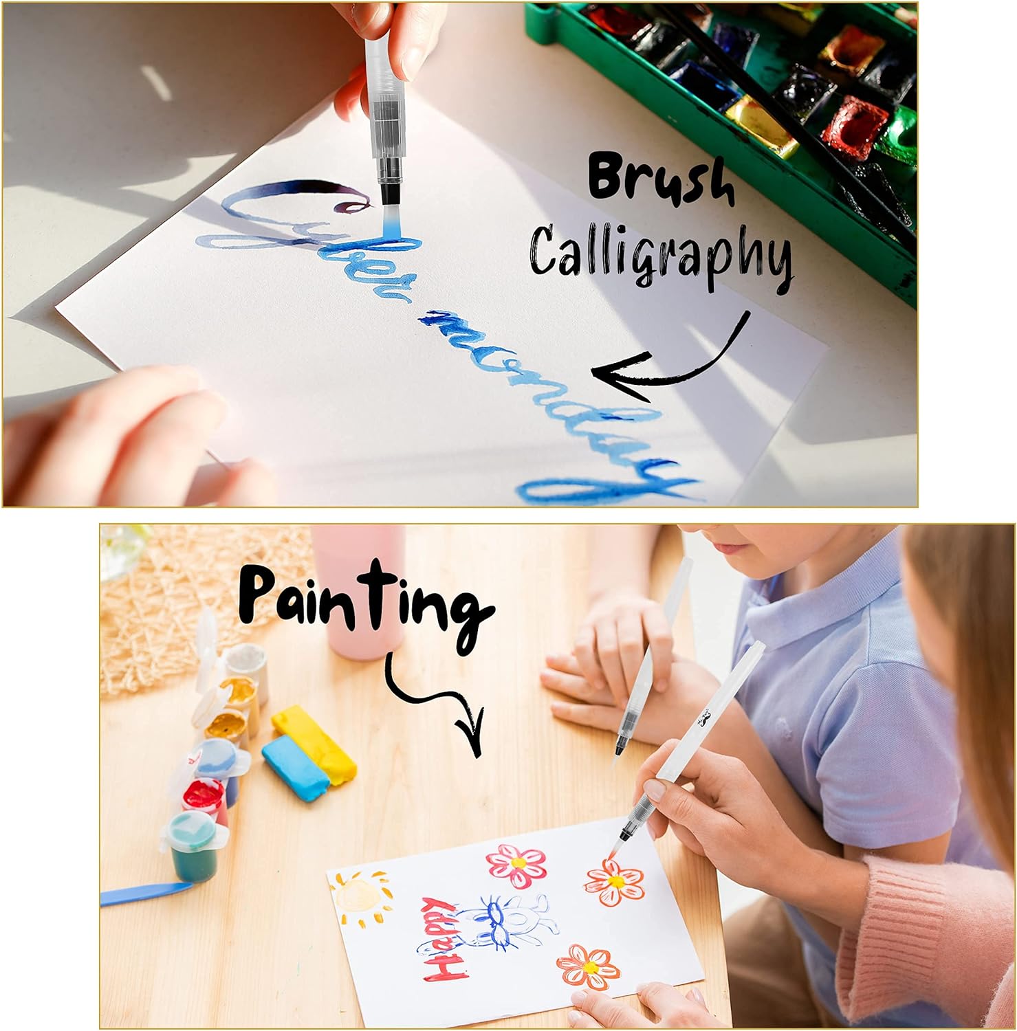 ⭐Simply screw off the barrel to add water or ink and then screw. Control the ink or water flow with just a squeeze of the barrel.